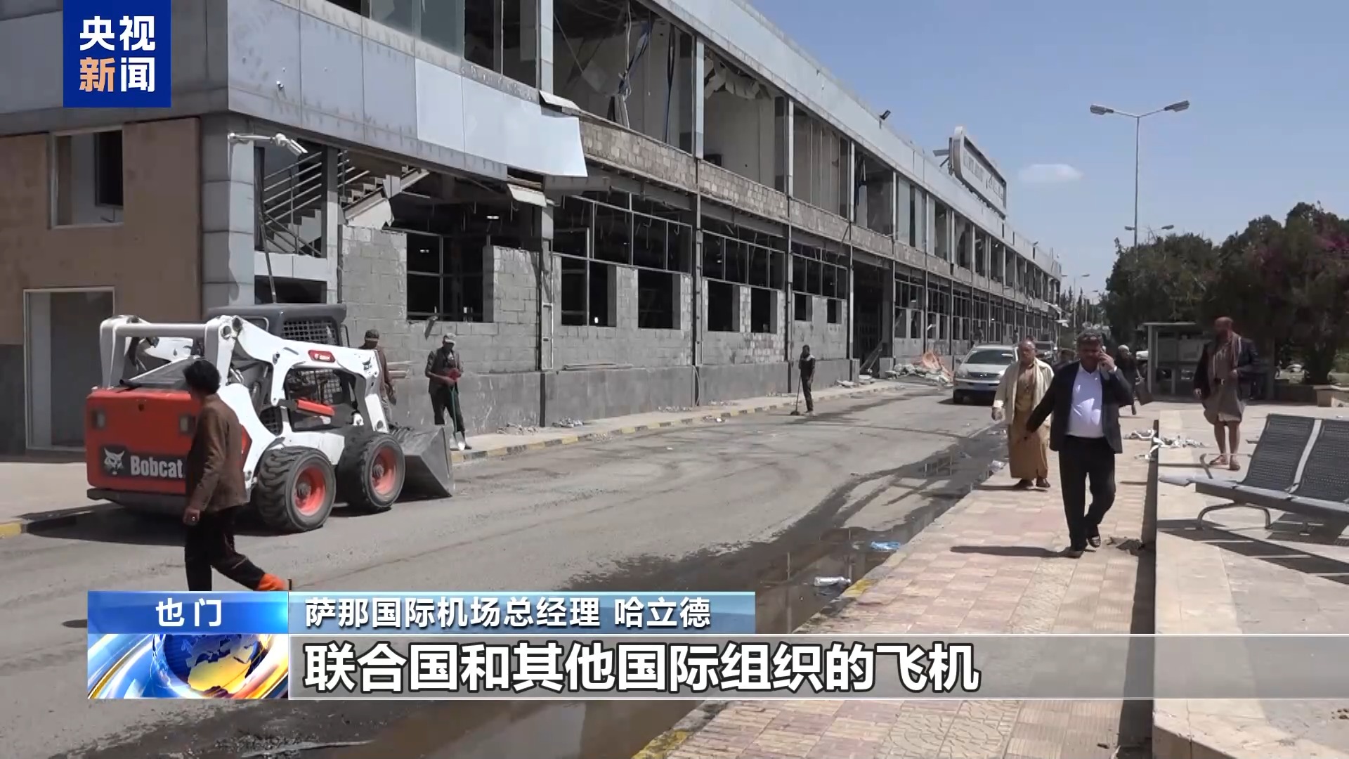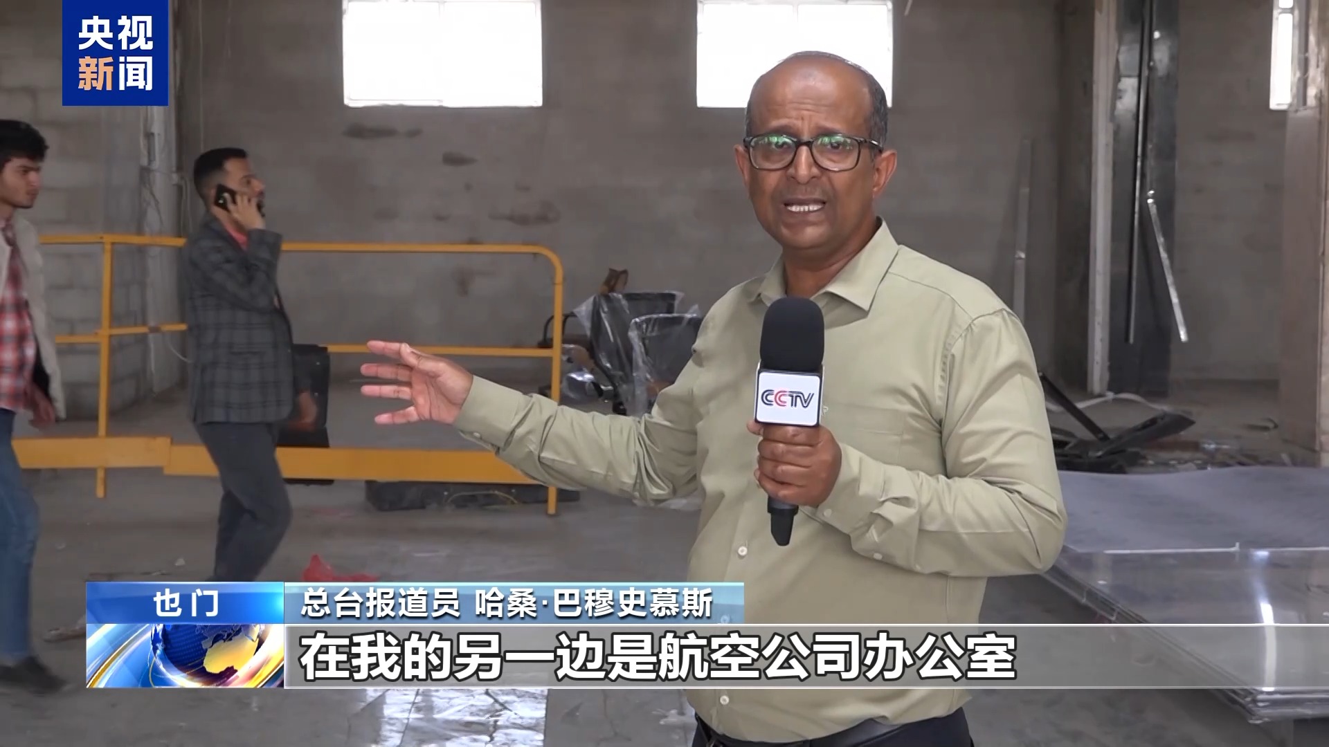 *總枱報道員 哈桑·巴穆史慕斯:*我們現在在薩那國際機場,現在我們看到所有的修復工作都在緊張進行中。機場跑道的修復工作已經完成,可供各型號飛機起降。在我的另一邊是航空公司辦公室和移民局的辦公室,工作還在繼續,也接近尾聲了。薩那國際機場負責人告訴我們,一切修復工作還在緊張進行中,機場將在未來幾天重新運營併為旅客服務。