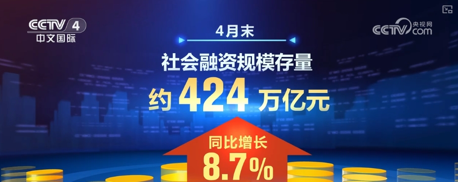 4月末,社會融資規模存量約424萬億元,同比增長8.7%;廣義貨幣(M2)餘額約325萬億元,同比增長8.0%,保持較高水平。