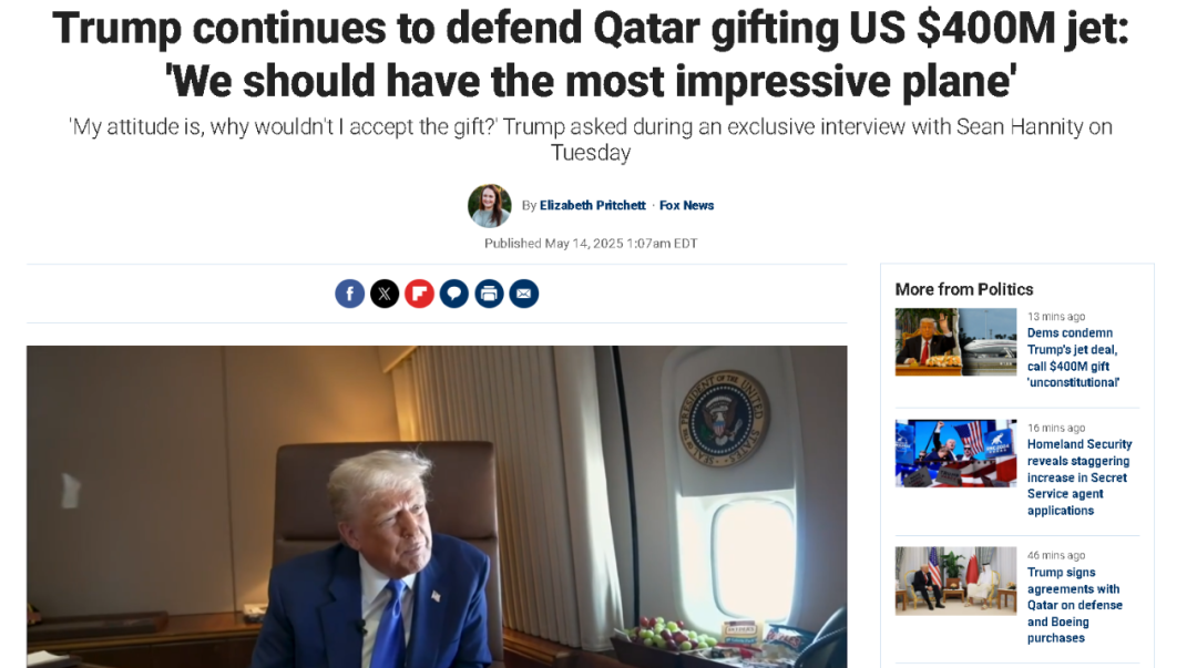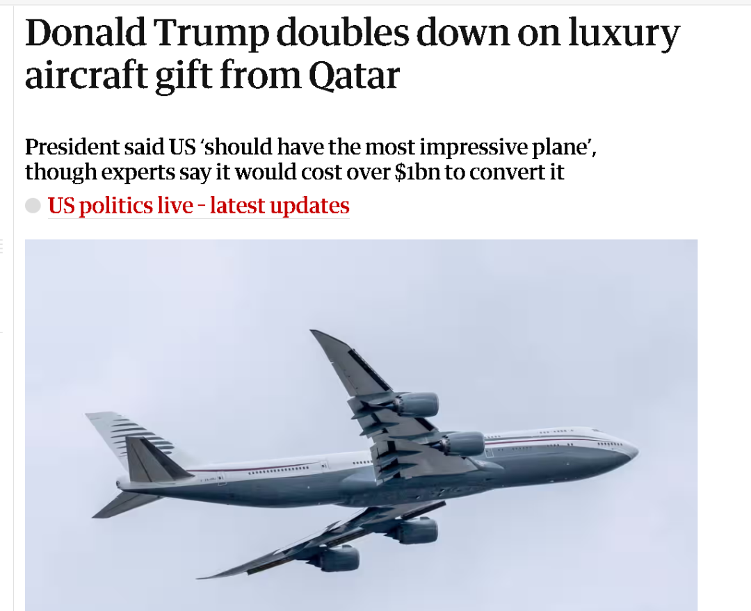 《衞報》稱,在“空軍一號”上接受美國福克斯新聞的最新採訪時,特朗普就給出了他對卡塔爾贈送的豪華客機如此渴求的原因。他説,他所乘坐的“空軍一號”已經服役近40年了,可他此次出訪的沙特、阿聯酋和卡塔爾,幾乎都擁有嶄新的波音747客機。