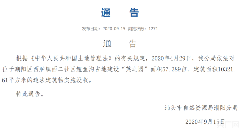 央廣網記者注意到,2020年9月,汕頭市自然資源局潮陽分局曾發佈通告稱,根據《中華人民共和國土地管理法》的有關規定,2020年4月29日,依法對位於潮陽區西臚鎮西二社區鯉魚溝佔地建設“英之園”面積57.389畝、建築面積10321.61平方米的違法建築物實施沒收。