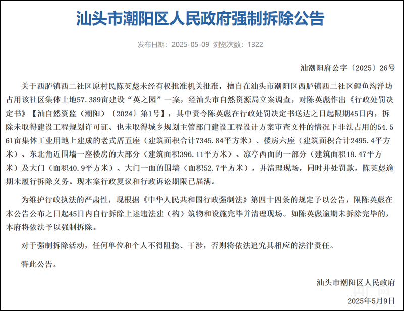 根據上述公告,經汕頭市自然資源局立案調查,對陳英彪作出《行政處罰決定書》【汕自然資監(潮陽)〔2024〕第1號】,其中責令陳英彪在行政處罰決定書送達之日起限期45日內,拆除未取得建設工程規劃許可證、也未取得城鄉規劃主管部門建設工程設計方案審查文件的情況下非法佔用的54.561畝集體工業用地上建成的老式厝五座(建築面積合計7345.84平方米)、樓房六座(建築面積合計2495.4平方米)、東北角近圍牆一座樓房的大部分(建築面積396.11平方米)、涼亭西面的一部分(建築面積18.47平方米)及大門(面積40.9平方米)、大門一面的圍牆(面積52.7平方米),並清理現場,同時並處罰款,陳英彪逾期未履行拆除義務。現本案行政複議和行政訴訟期限已屆滿。