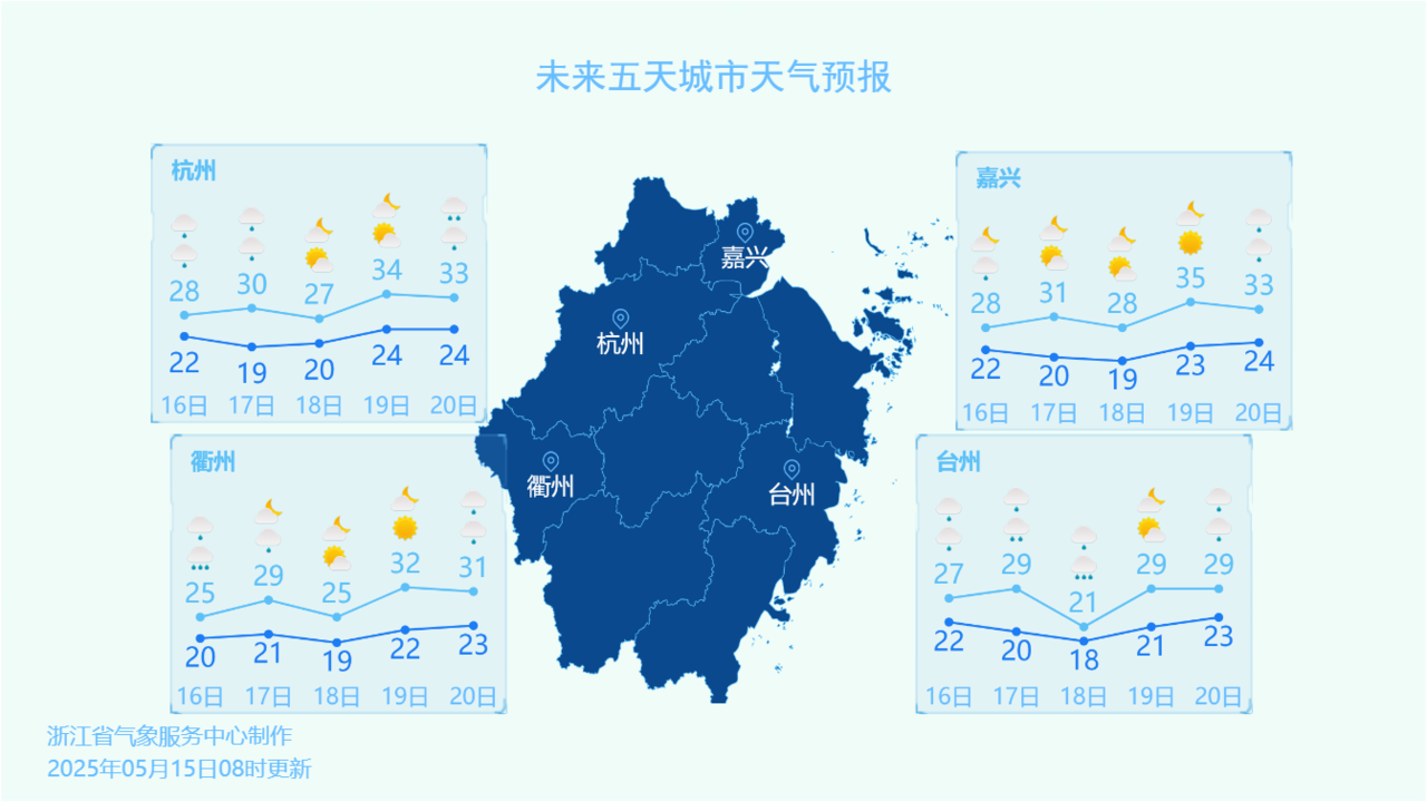 來自浙江天氣的數據顯示,今天早間氣温不低,全省普遍在16-20℃,預計今天白天最高温度浙西地區27-29℃,其它地區30-32℃,熱意不減。