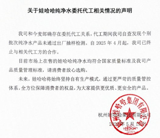 娃哈哈表示,公司和今麥郎確存在委託代工關係,代工期間公司自查發現個別批次純淨水產品未通過出廠抽樣檢測。自2025年4月起,公司已終止與相關代工方的合作。娃哈哈稱,目前市場上在售的娃哈哈純淨水均符合國家質量標準及公司產品質量管理標準,請消費者放心選購。未來,娃哈哈將始終堅持自有生產模式,通過更嚴苛的質量管控體系,全方位保障消費者的權益,為大家提供更優質、更安全的產品。(文馨)