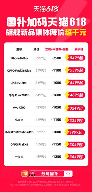 此外,三星S25 Ultra、榮耀GTPro、REDMI Turbo 4 Pro、一加13T……等上半年首發的新品手機,到手價也都在618迎來歷史新低。首個國補加碼的天貓618,手機品牌們加碼真金白銀搶佔先機,618爭奪戰才剛剛開始。