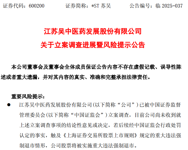 2025年以來江蘇吳中已披露多起負面事件。2月27日,江蘇吳中披露了《江蘇吳中醫藥發展股份有限公司關於收到中國證券監督管理委員會立案告知書暨風險提示公告》,因公司涉嫌信息披露違法違規,根據相關法律法規,中國證監會決定對公司立案。3月8日,江蘇吳中又披露其全資子公司江蘇吳中進出口有限公司及時任法定代表人、董事長楊鋒因協助林錫欽等人實施騙取出口退税,被起訴追究刑事責任。4月22日,江蘇吳中披露了《關於部分銀行賬户被凍結的公告》,因公司全資孫公司江蘇吳中醫藥銷售有限公司(以下簡稱銷售公司)貸款逾期,江蘇吳中及銷售公司的部分銀行賬户被凍結。