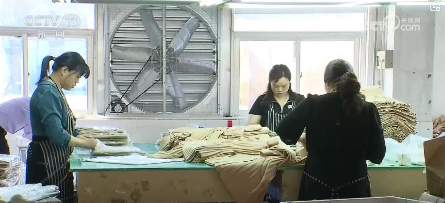 在上海松江區李塔匯鎮的這家針織廠,全員上崗,縫商標、熨燙、打吊牌,各個工序有條不紊。