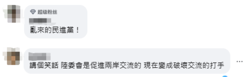 還有人稱,“亂來的民進黨!”“講個笑話 陸委會是促進兩岸交流的 現在變成破壞交流的打手”。