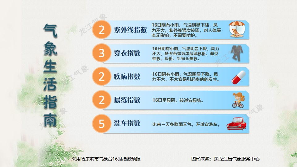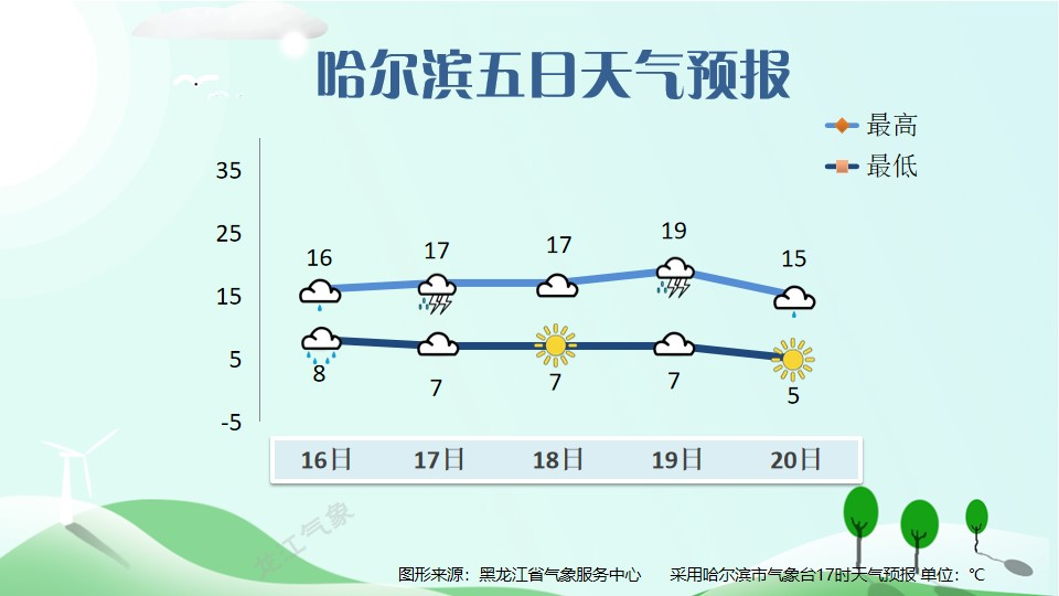 16日白天最高氣温:大興安嶺北部、齊齊哈爾西部、大慶13~15℃,七台河、雞西20~22℃,牡丹江24~26℃,其它地區16~18℃。