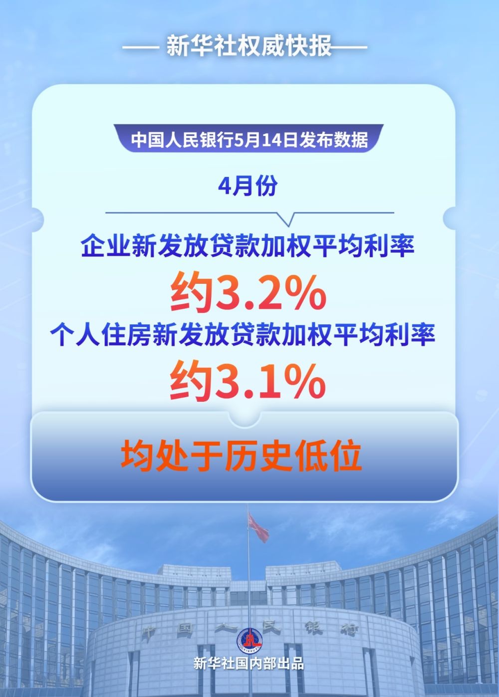 中國人民銀行的數據顯示,4月份,企業新發放貸款加權平均利率約3.2%,比上年同期低約50個基點;個人住房新發放貸款加權平均利率約3.1%,比上年同期低約55個基點,均處於歷史低位。