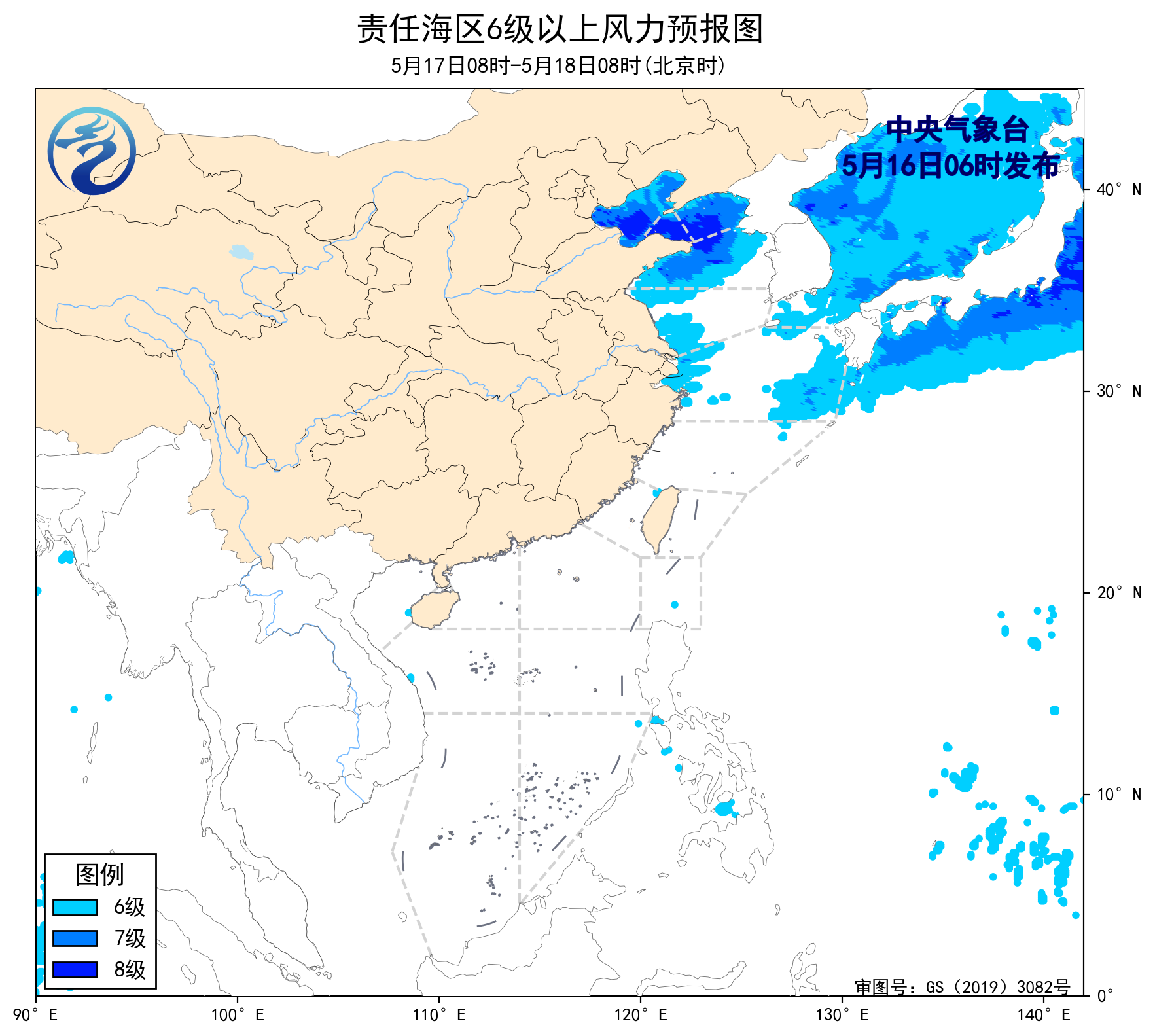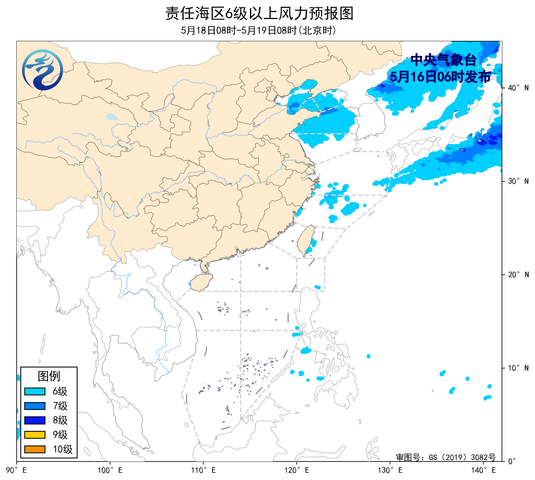16日08時至17日08時,渤海將有5~6級、陣風7級的偏南風增大到7~8級、陣風9~10級的西北風,東海北部海域將有6~7級、陣風8~9級的偏南到西南風,渤海海峽、黃海北部海域將有4~6級、陣風7級的偏南風,黃海中部海域將有5~6級、陣風7級的偏東轉偏南風,黃海南部海域將有5~6級、陣風7級的西南風到偏西風。渤海、東海西部海域將有輕霧,能見度不足10公里,渤海海峽、黃海大部海域、遼東半島東部沿岸海域、成山頭附近海域、大連港、青島港、日照港、連雲港將有大霧,能見度不足1公里。