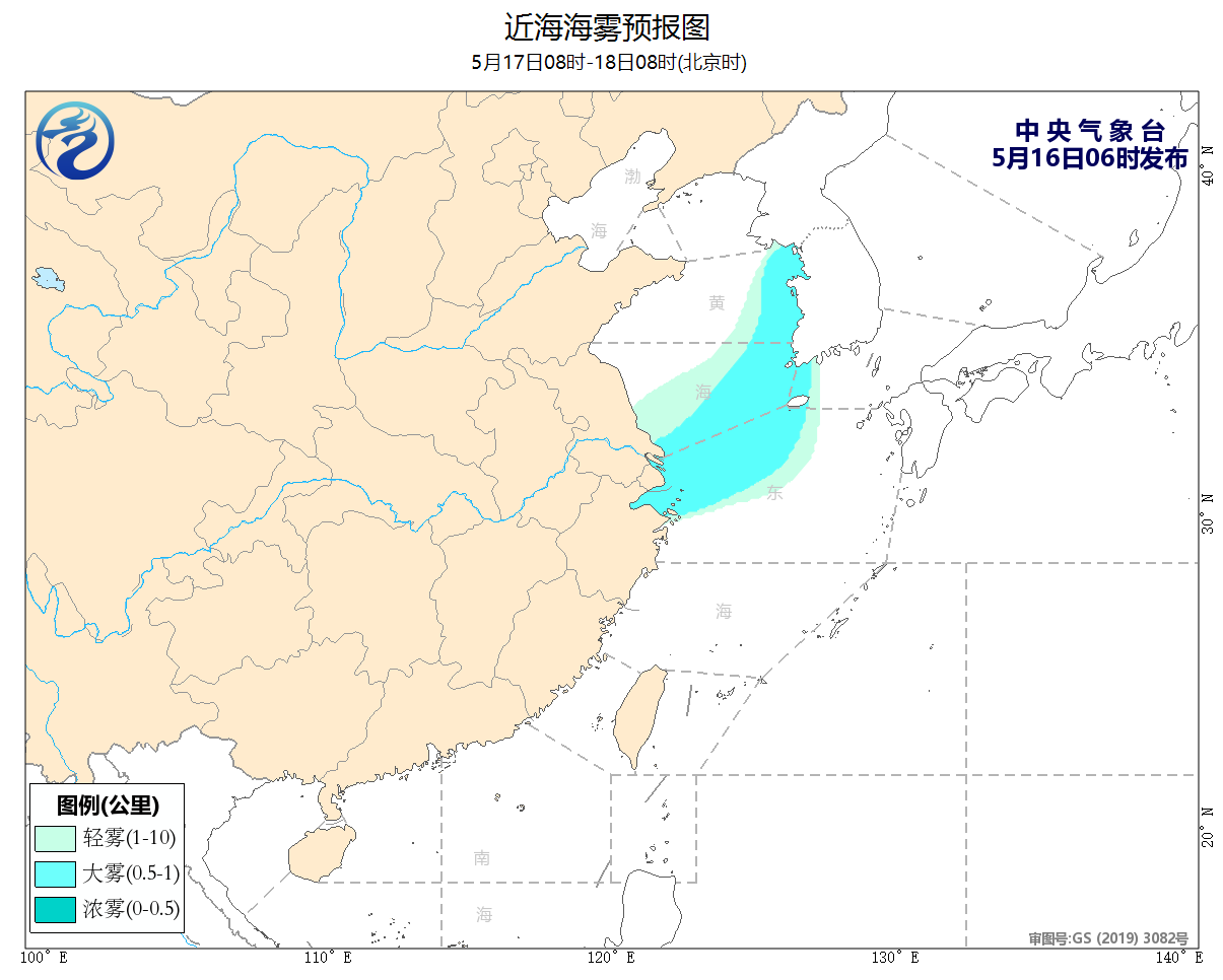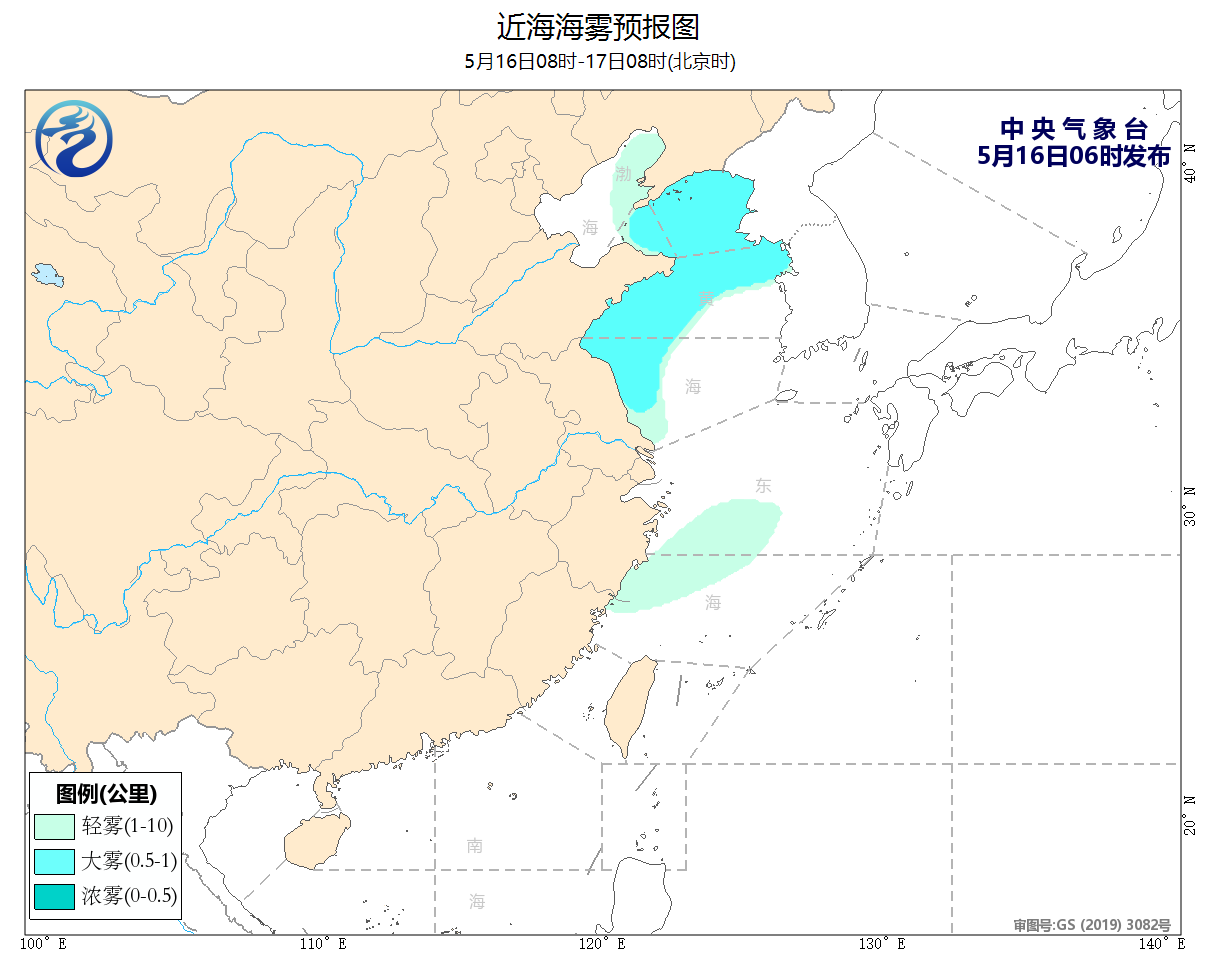 中央氣象台5月16日06時繼續發佈《大霧黃色預警》和《大風藍色預警》。