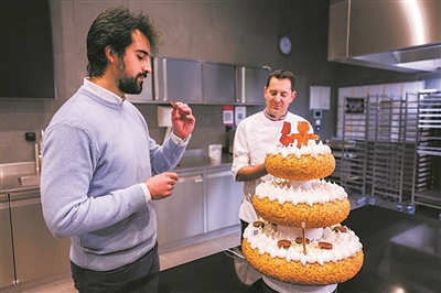 “機器食品”的最新傑作是RoboCake。這款三層婚禮蛋糕頂部裝飾着石榴口味的明膠軟糖機器人,可藉助氣動系統活動頭部和手臂;底層嵌有由維生素B2、槲皮素和巧克力製成的可食用電池,能為LED蠟燭供電。