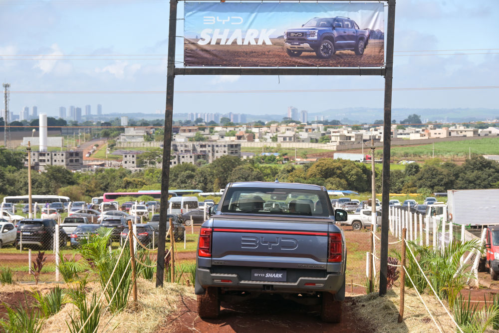 2025年4月29日,在巴西聖保羅州里貝朗普雷圖市舉行的2025年巴西農業科技展上,一輛比亞迪皮卡進行越野演示。新華社記者 陳昊佺 攝