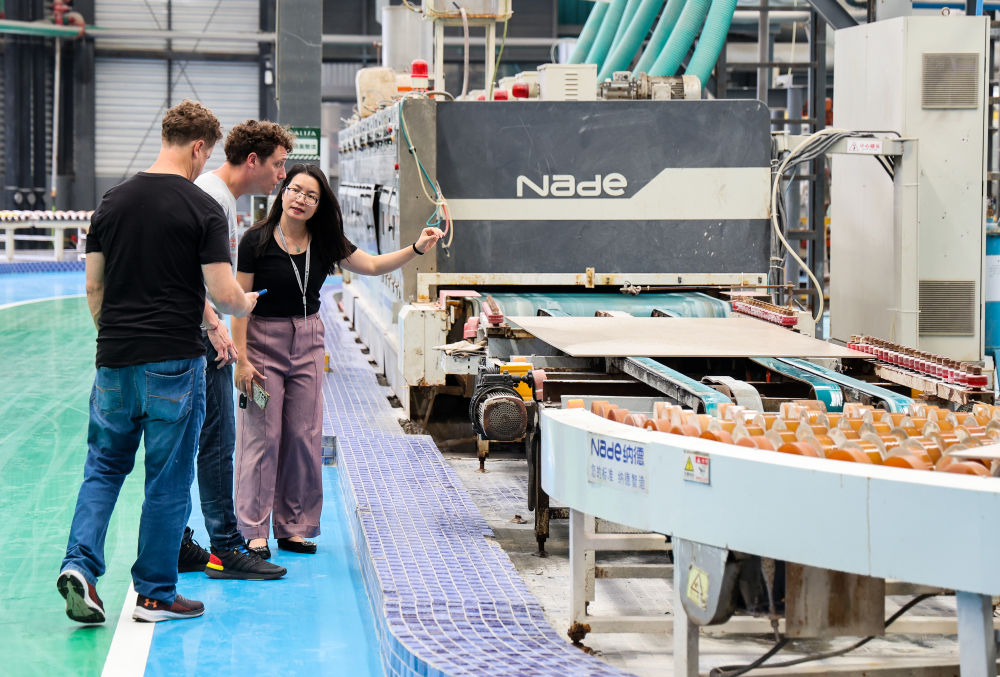 2025年4月22日,兩名參加廣交會的阿根廷採購商專程來到佛山參觀蒙娜麗莎大尺寸陶瓷巖板自動生產線。新華社記者 劉大偉 攝