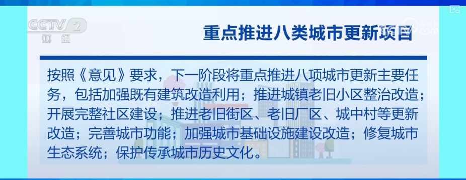 按照《意見》要求,下一階段,將重點推進八項城市更新主要任務,包括加強既有建築改造利用;推進城鎮老舊小區整治改造;開展完整社區建設;推進老舊街區、老舊廠區、城中村等更新改造;完善城市功能;加強城市基礎設施建設改造;修復城市生態系統;保護傳承城市歷史文化。