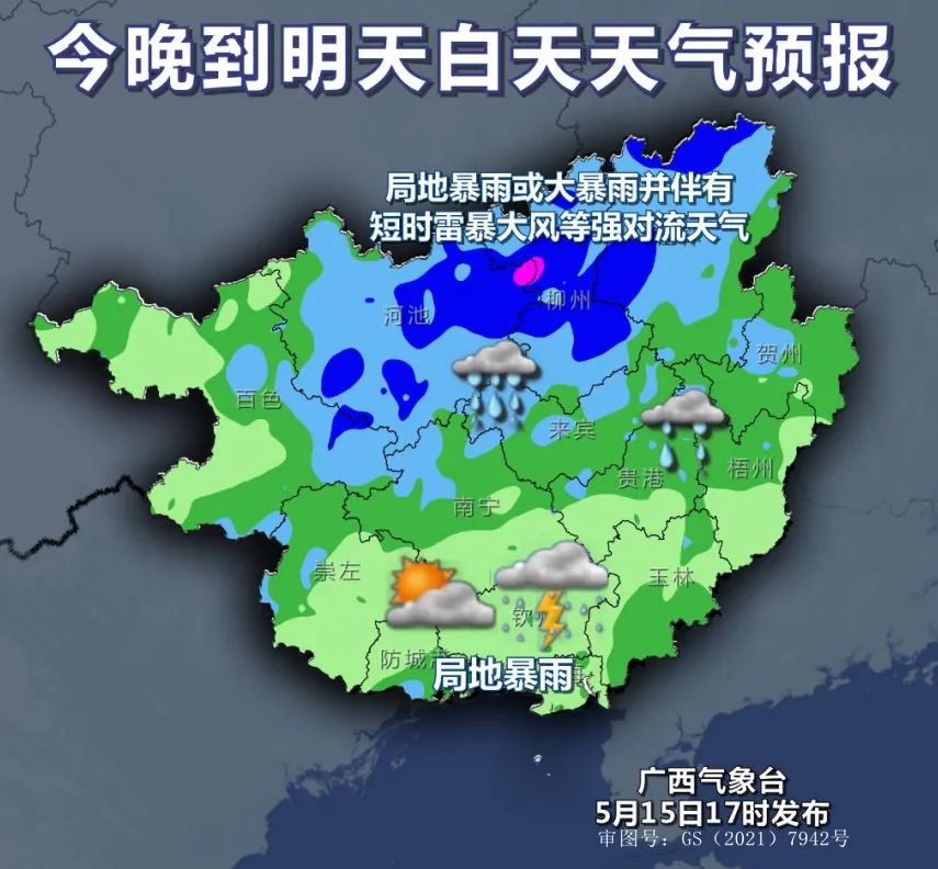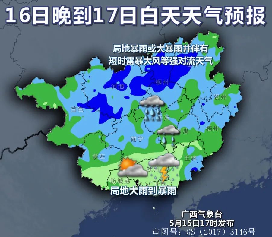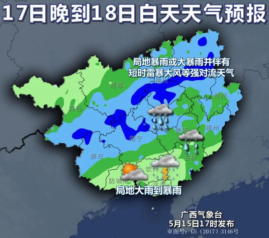 5月17日-18日,我市中北部有中到大雨、局部暴雨,南部小到中雨、局部大雨,可能伴有短時雷暴大風、冰雹等強對流天氣。最有可能出現暴雨以上降雨的縣(市、區)有興安和靈川各鄉鎮。偏南風1-2級。