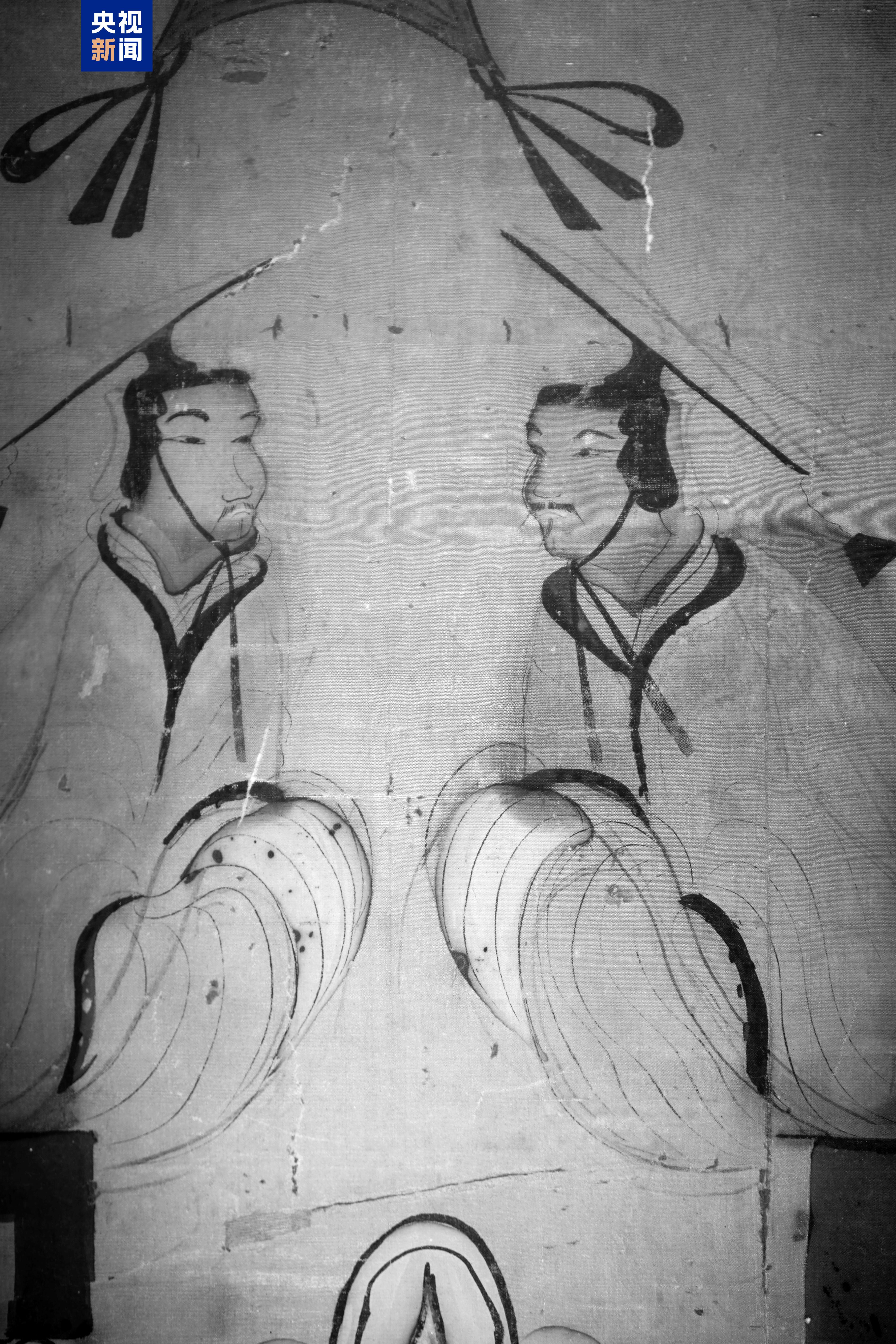 *一處改繪痕跡出現在T形帛畫上部:*這裏描繪着天國大門左右兩邊,有兩位天國守門神,拱手而坐,迎接墓主人靈魂升入天國。高光譜影像顯示出,兩位守門神的手部,有手握玉圭的線條痕跡,應為繪製帛畫的匠人畫的底稿,後來改動,把手部動作畫成拱手狀。