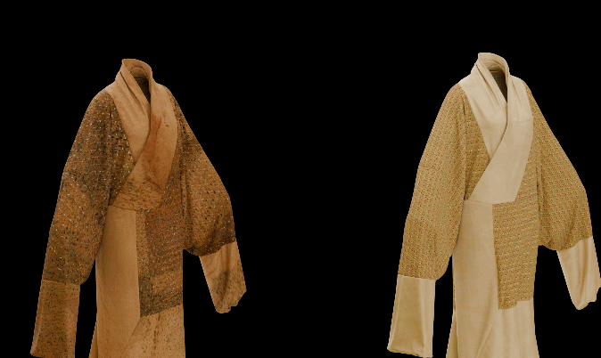湖南博物院數據中心主任何也介紹,基於對文物本體超高清數據採集工作,協同創新團隊採用數字化建模、搭建AI輔助工具等技術手段,做出兩件“赭黃色紗地印花敷彩絲綿袍”數字孿生模型,一件還原出印花敷彩絲綿袍兩千多年前的“新衣”狀態,另外一件仿製文物出土之後、保存至今的“舊衣”狀態。