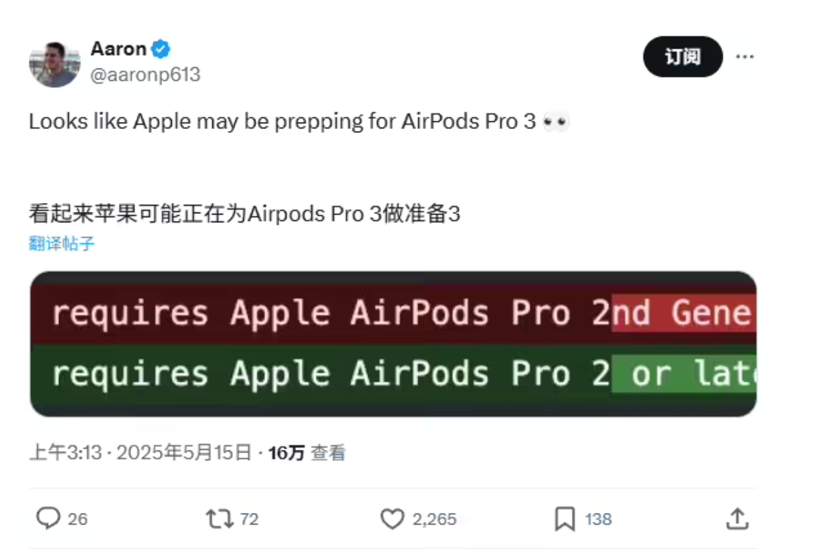 據Perris透露,蘋果系統代碼中原先標註的“AirPods Pro 2nd Generation”現已變更為“AirPods Pro 2 及更新型號”。這一代碼上的細微變化,不僅意味着蘋果官方開發團隊正在為新一代產品的發佈做準備,也預示着某些原本專為AirPods Pro 2設計的功能將可能兼容於即將到來的AirPods Pro 3上。