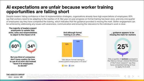 上海2025年5月16日 /美通社/ -- 近日,全球領先人力資源諮詢與解決方案提供商德科集團(The Adecco Group)發佈2025年商業領袖研究報告——《引領人工智能時代:期望與現實(Leading in the age of AI: Expectations versus reality)》。該研究連續第二年開展,對13個國家、17個行業的2,000名企業高管(C-Suite)展開調研,揭示儘管企業加大AI投資,但僅有10%的公司達到"未來就緒"標準,即具備支持員工適應AI變革的結構化戰略。