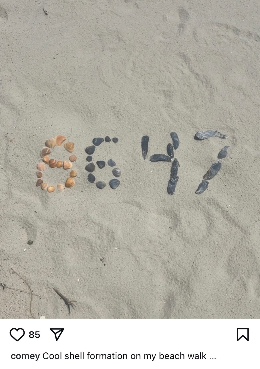報道稱,科米15日在Instagram上發佈的一張圖片顯示,多個貝殼在沙灘上排列成數字“8647”的形狀,科米還在這條帖子下評論稱,“我在海灘上散步,(看到)這個很酷的貝殼造型……”。福克斯新聞網解釋稱,“86”通常被用作呼籲謀殺或除掉某人的號碼,《紐約時報》則稱,“86”通常被用作俚語,表示撤掉某物或將某人趕走——尤其是在餐廳和酒吧裏指菜單上的菜品時。而特朗普正在擔任美國第47任總統。目前,該帖子已被刪除。