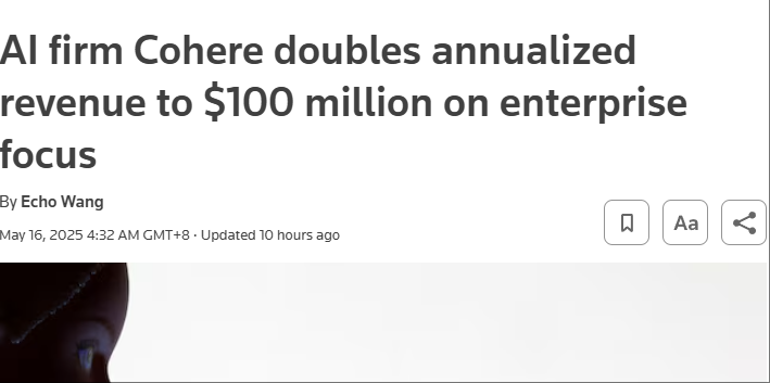 據一位知情人士透露,截至2025年5月,該公司年化收入已突破1億美元。不過,Cohere公司發言人拒絕就財務狀況發表評論。