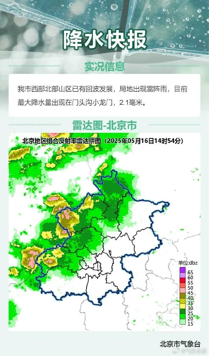我市西部北部山區已有回波發展,局地出現雷陣雨,目前最大降水量出現在門頭溝小龍門,為2.1毫米。