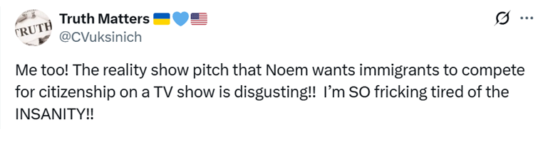 還有網友説,“諾姆想讓移民在真人秀電視節目中競爭公民身份,真是令人作嘔!我受夠了這種愚蠢的行為!!”↓