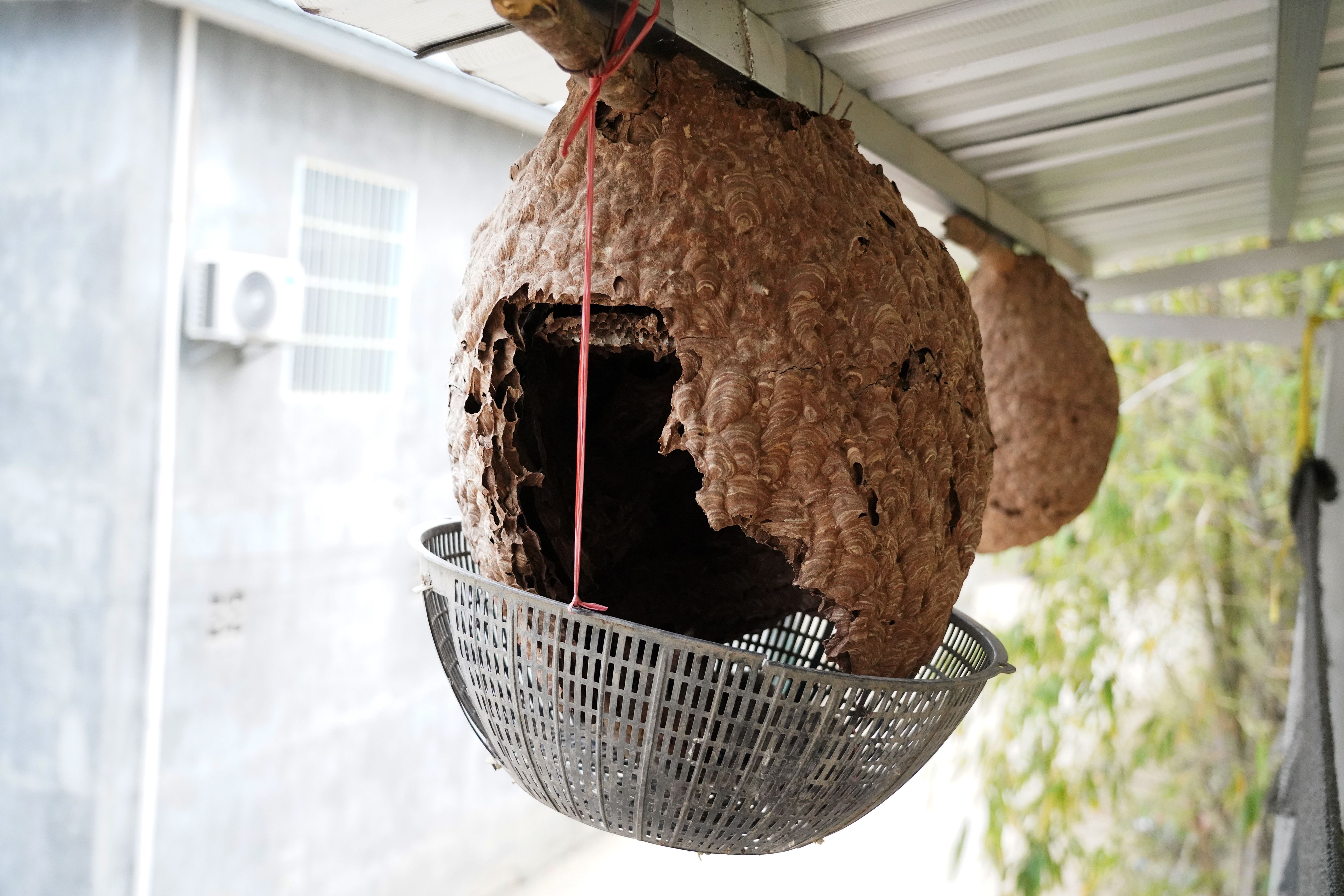 在雲南省德宏州盈江縣油松嶺鄉亞麻廠搬遷點楊榮敬的養蜂基地,屋檐下懸掛的蜂巢不時在風中輕輕搖晃。楊榮敬戴上手套,輕手輕腳地爬上梯子,將盤子裏為領角鴞準備的食物小心地放入蜂巢內。此時,巢內的一隻雌性領角鴞和兩隻毛茸茸的幼鳥正瞪着琥珀色的大眼睛張望。這個本應用於養殖葫蘆蜂的巢穴,意外地成為了國家二級重點保護野生動物——領角鴞的育雛之所。