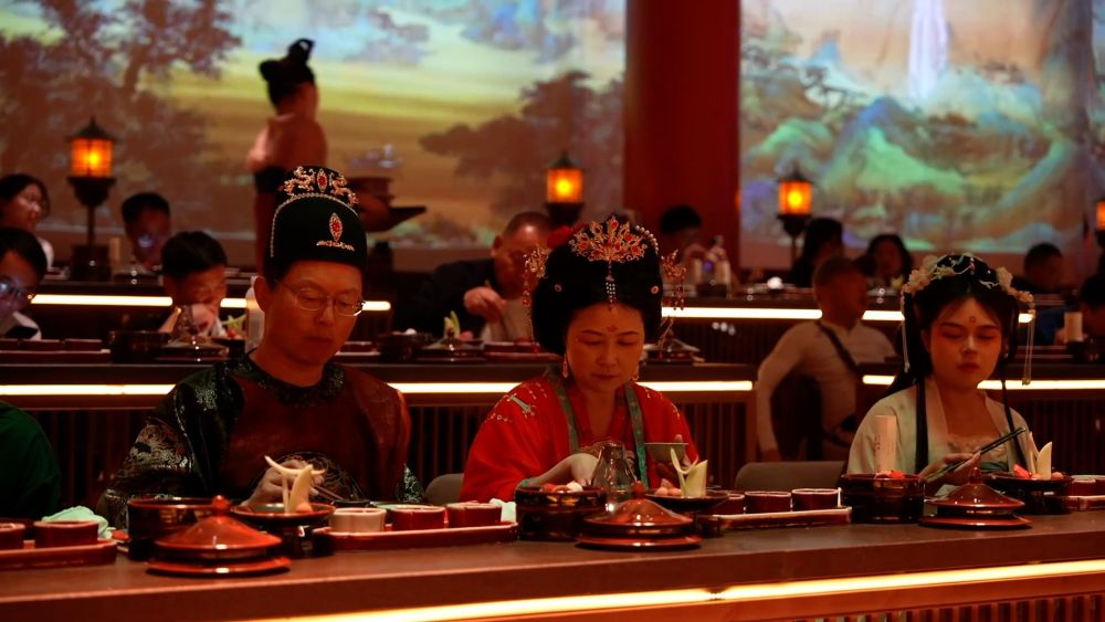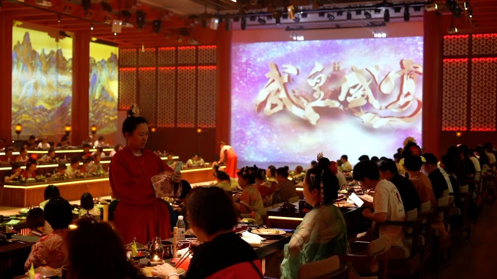 洛陽打造的"武皇盛宴"項目,將武則天故事與牡丹、龍門石窟等元素完美融合。通過全息投影、巨幅水幕等科技手段,讓遊客在品嚐美食的同時穿越回大唐盛世。十三坊特色街區還設有"妝造司",遊客可換上漢服沉浸體驗,三家門店場場爆滿,需提前一週預約。