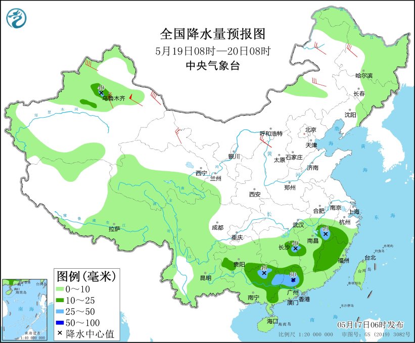 圖4 全國降水量預報圖(5月19日08時-20日08時)
