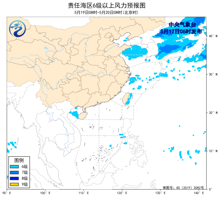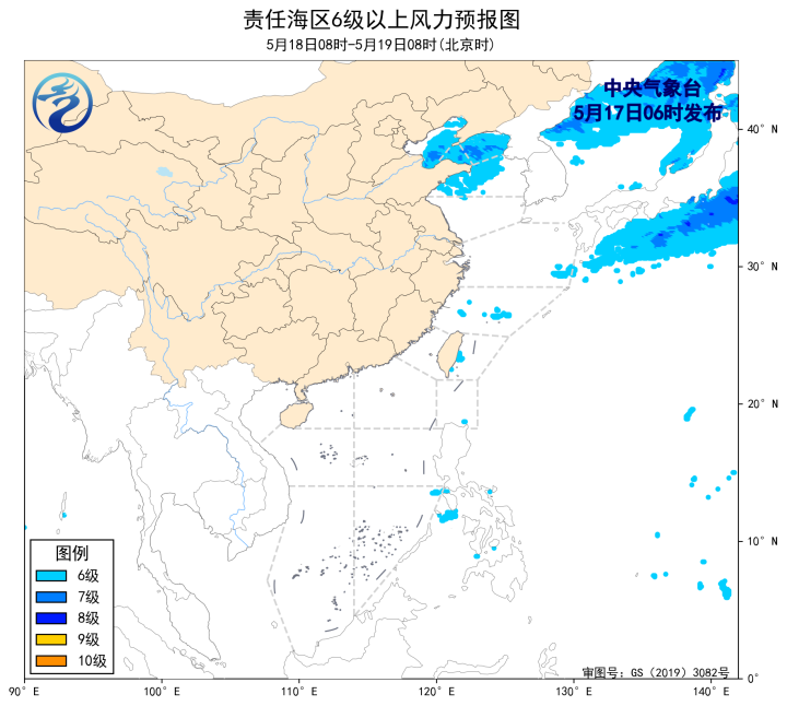 19日08時至20日08時,黃海中部海域將有5~6級、陣風7級的西南風到偏南風。
