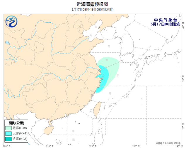 中央氣象台5月17日06時繼續發佈《大風藍色預警》和《大霧黃色預警》。