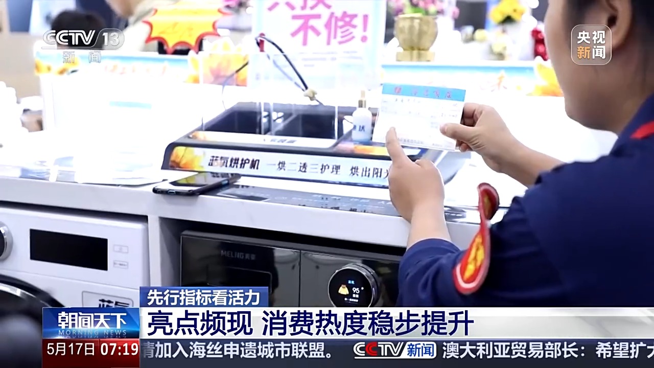 國家信息中心今天(17日)發佈了一系列先行指標,記者從中發現,4月份以來,在一系列宏觀政策協同發力下,消費、投資、工業生產等多領域保持向好態勢。