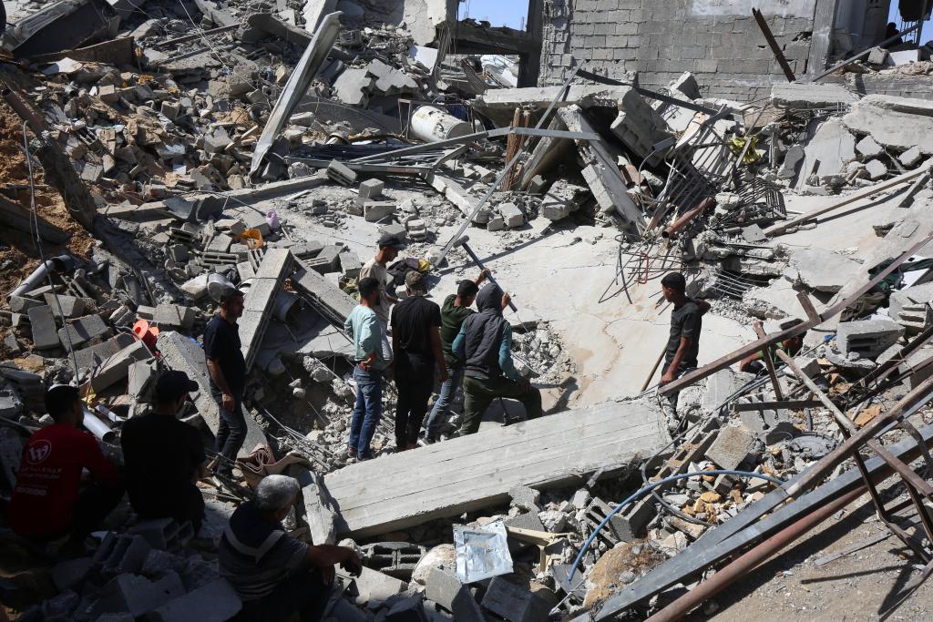 5月16日,在加沙地帶北部傑巴利耶難民營,人們查看以軍襲擊後的建築廢墟。新華社發(裏澤克·阿卜杜勒賈瓦德攝)