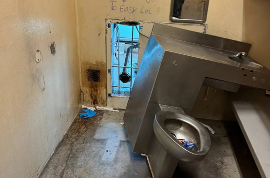 報道稱,越獄大約發生在凌晨00:23左右,監控畫面顯示,囚犯們從監獄裝卸區的門逃出後,翻越圍牆並穿過州際公路。警方從現場調查發現,涉事牢房的牆壁被鑿出一個“僅能一人擠過”的矩形洞口,緊鄰洞口的金屬馬桶和洗手池被整體拆下。洞口上方還留有塗鴉:一張吐舌頭的笑臉及挑釁文字“太容易了,笑死”。