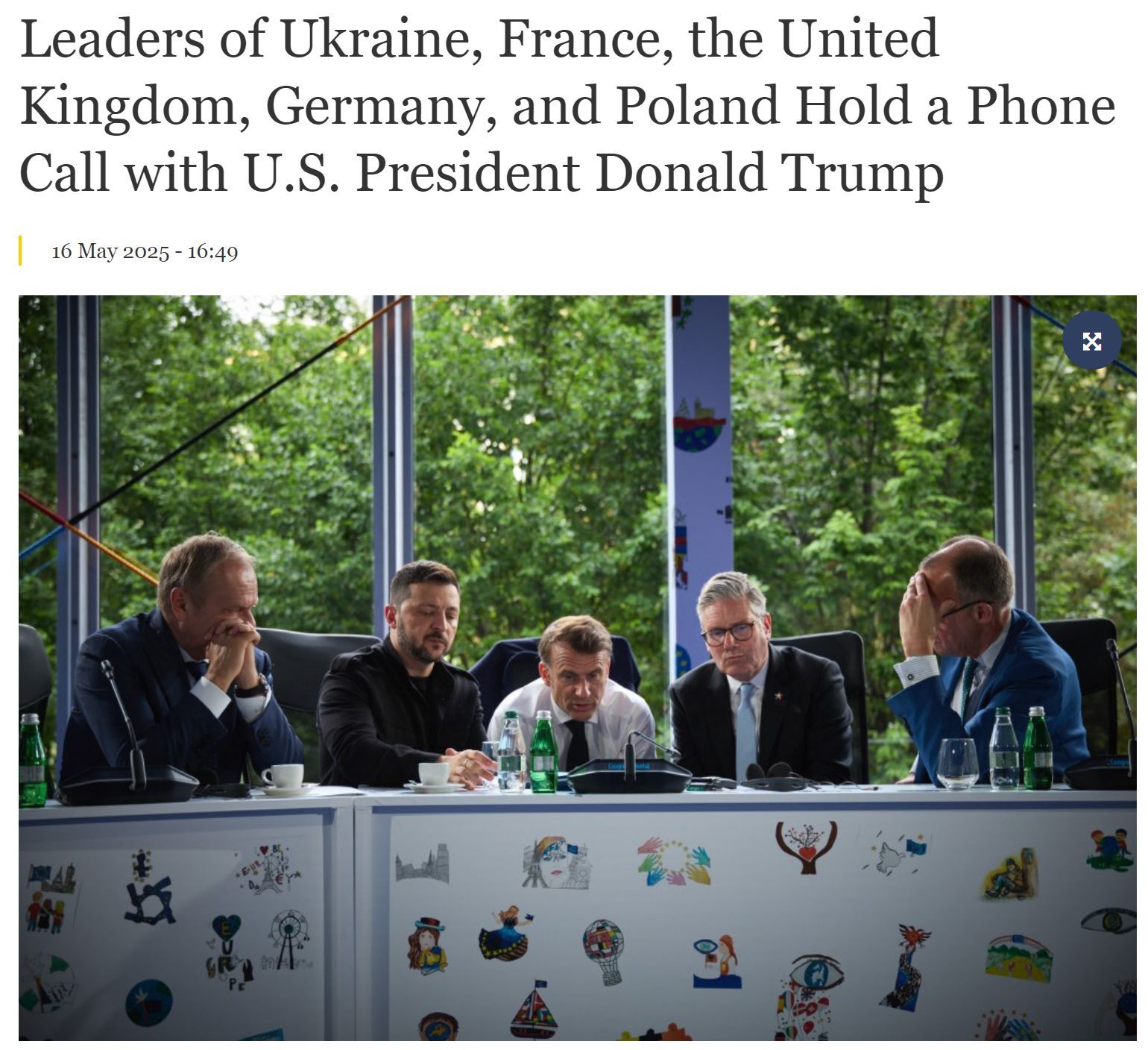 △烏克蘭總統府官網報道:烏克蘭總統澤連斯基(左二)、法國總統馬克龍(左三)、英國首相斯塔默(右二)、德國總理默茨(右一)和波蘭總理圖斯克(左一)在阿爾巴尼亞首都地拉那出席歐洲政治共同體領導人會議期間與美國總統特朗普通電話。