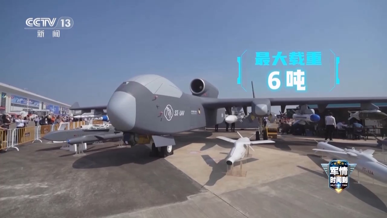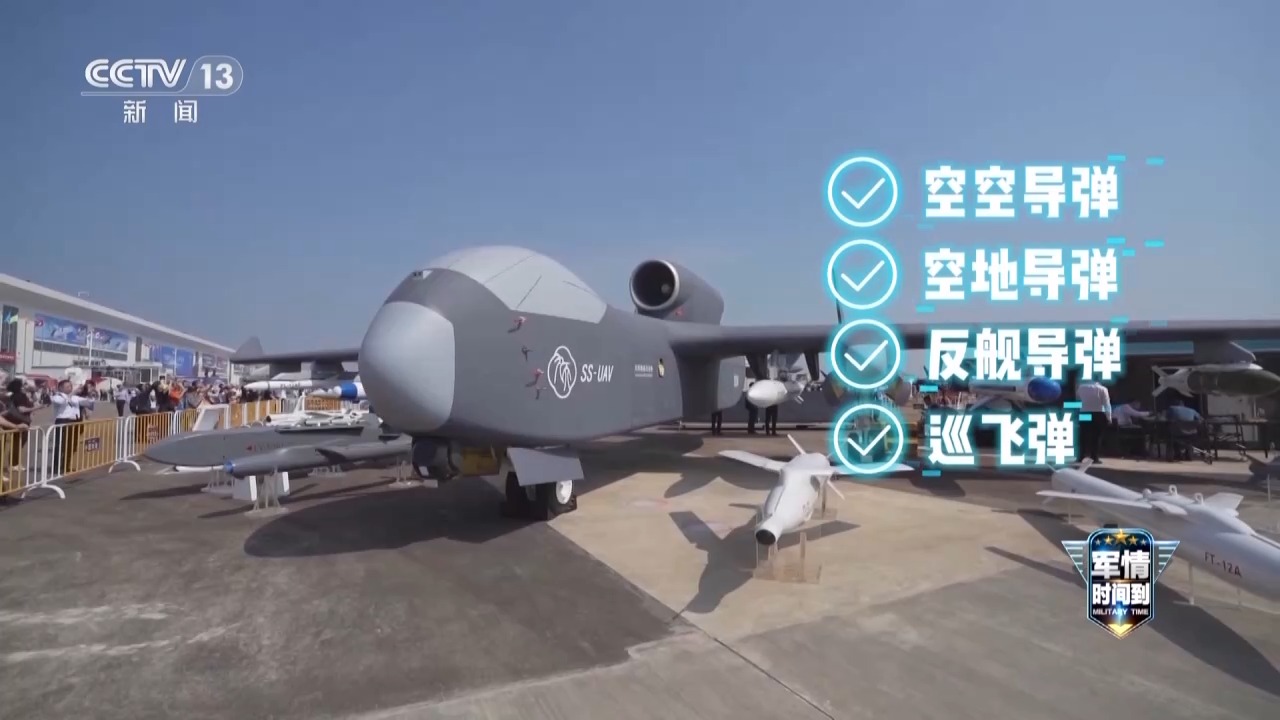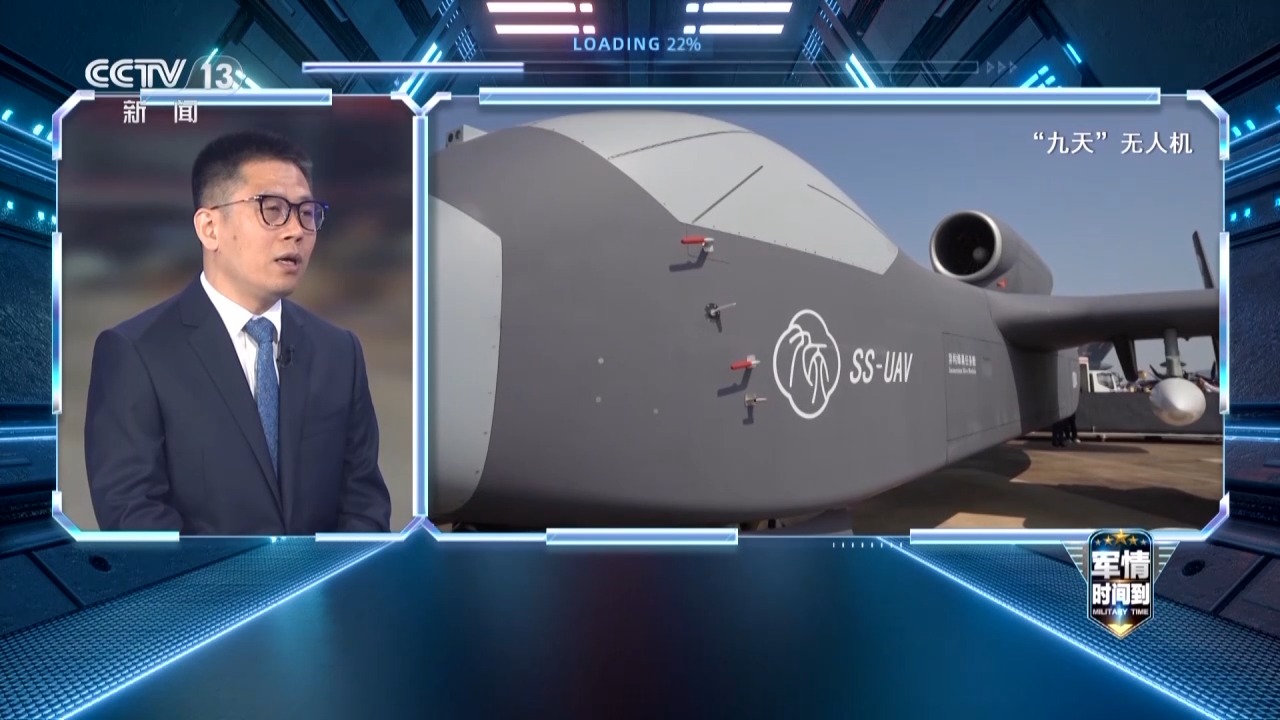 專家:“九天”無人機在進行作戰的時候,可以攜帶多元化的載荷。一方面可以搭載進攻性的武器,比如説它有這個掛架,其中四個掛架可以掛載一噸的載荷,你像一噸的載荷,這樣的導彈就非常大了。在中國航展上,我們可以看到它也可以掛載這種防區外發射導彈。這種導彈一打就會打好幾百公里,而且還可以進行隱身突防,威力非常大。它還可以掛載一些小型的無人機。可以説目前的對地打擊載荷它基本上都能掛載。而且在中國航展上我們也看到它可以掛載中距的空中導彈。比如説霹靂-12E。那麼導彈既可以進行自備,也可以對對方的空中目標進行先敵發射、先敵打擊。我覺得更重要的是,如果它搭載了比較先進的電子戰吊艙,那麼可以壓制對方的雷達、干擾對方的雷達,提高自身的生存能力。那麼如果説能夠搭載定向紅外干擾系統,通過激光束去幹擾對方的紅外製導導彈,可以極大地提高它的生存能力。所以它那麼高的掛載能力可以掛載多元化的武器。既可以提高它的突防打擊能力,也可以提高自己的生存能力。