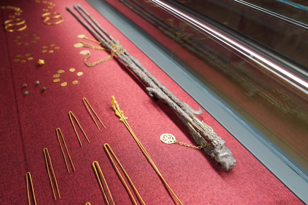 記者在博物館內看到,這座磚室墓平面為十字形結構,佔地約150平方米,長約15米,寬約10米,大墓出土文物一同陳列於旁,包括58件金器、4件銅器及若干件瓷器,其中一件龍首金釵吸引不少參觀者的目光。這根金釵長26釐米,重27.1克,頂端為一龍首,用細金條、金片、炸珠等勾勒出眼睛、耳朵、角等,工藝精湛、栩栩如生,其與另一件展陳在蘇州博物館的鳳首金釵為一對,屬於較為少見的孫吳王室高等級金器,考古人員判斷其主人是一位地位較高的年輕女性。