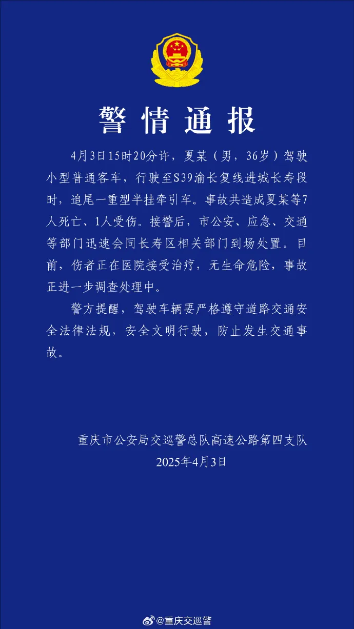據重慶警方通報,2025年4月3日15時20分許,一小型普通客車行駛至S39渝長複線進城長壽段時追尾**一重型半掛牽引車,事故共7人死亡、1人受傷。