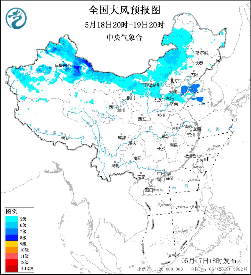 預計,5月17日20時至18日20時,新疆北部和東部、內蒙古大部、山西北部、黑龍江東部等地有5~6級、陣風7~8級的大風,新疆北部、內蒙古西部等地部分地區有6~7級、陣風8~9級的大風;渤海南部、渤海海峽、黃海北部和西南部海域將有7級、陣風8級的大風。