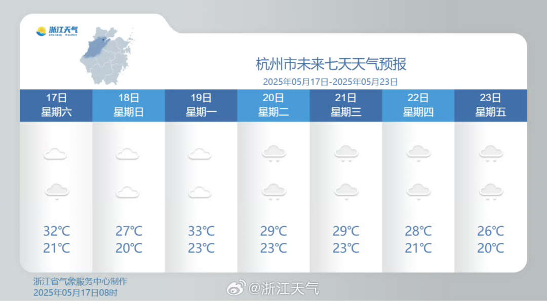 在雨水頻繁攪擾下,氣温算是忍住夏日“大火氣”,高温暫時沒戲,未來一週最高氣温浙北31~34℃,浙中南28~31℃。