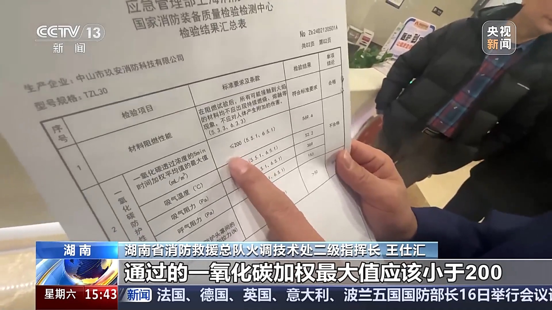 *湖南省消防救援總隊火調技術處二級指揮長 王仕**匯:*它的不合格內容主要是這個一氧化碳的防護性能,也就是正常的情況下通過的一氧化碳加權最大值應該小於200,但從我們檢查的情況來看達到了569.4,嚴重超過了標準值,達不到有效防護以及過濾一氧化碳的作用。