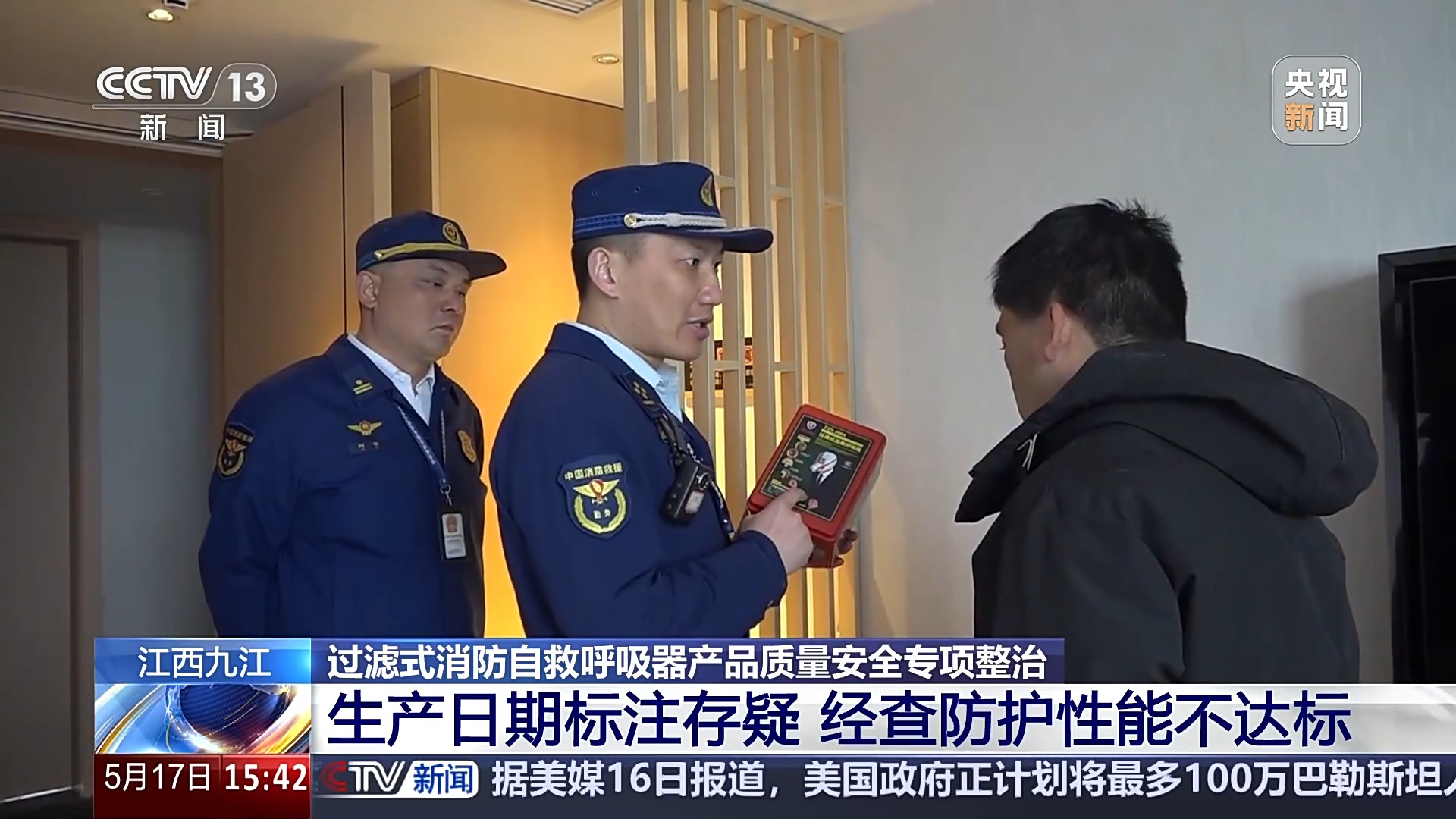 在江西省九江市八里湖新區的一家新開業的民宿,記者跟隨消防執法監督人員在查看房間內存放的過濾式消防自救呼吸器時,發現產品的外觀並無異常,但使用手機掃描產品上的二維碼時,卻顯示該批次過濾式消防自救呼吸器的生產日期為2022年12月,與該產品表面標註的2023年4月有明顯差距。隨後,消防執法監督人員又通過中國消防產品信息網,查詢到該產品的生產企業無任何強制性認證信息。