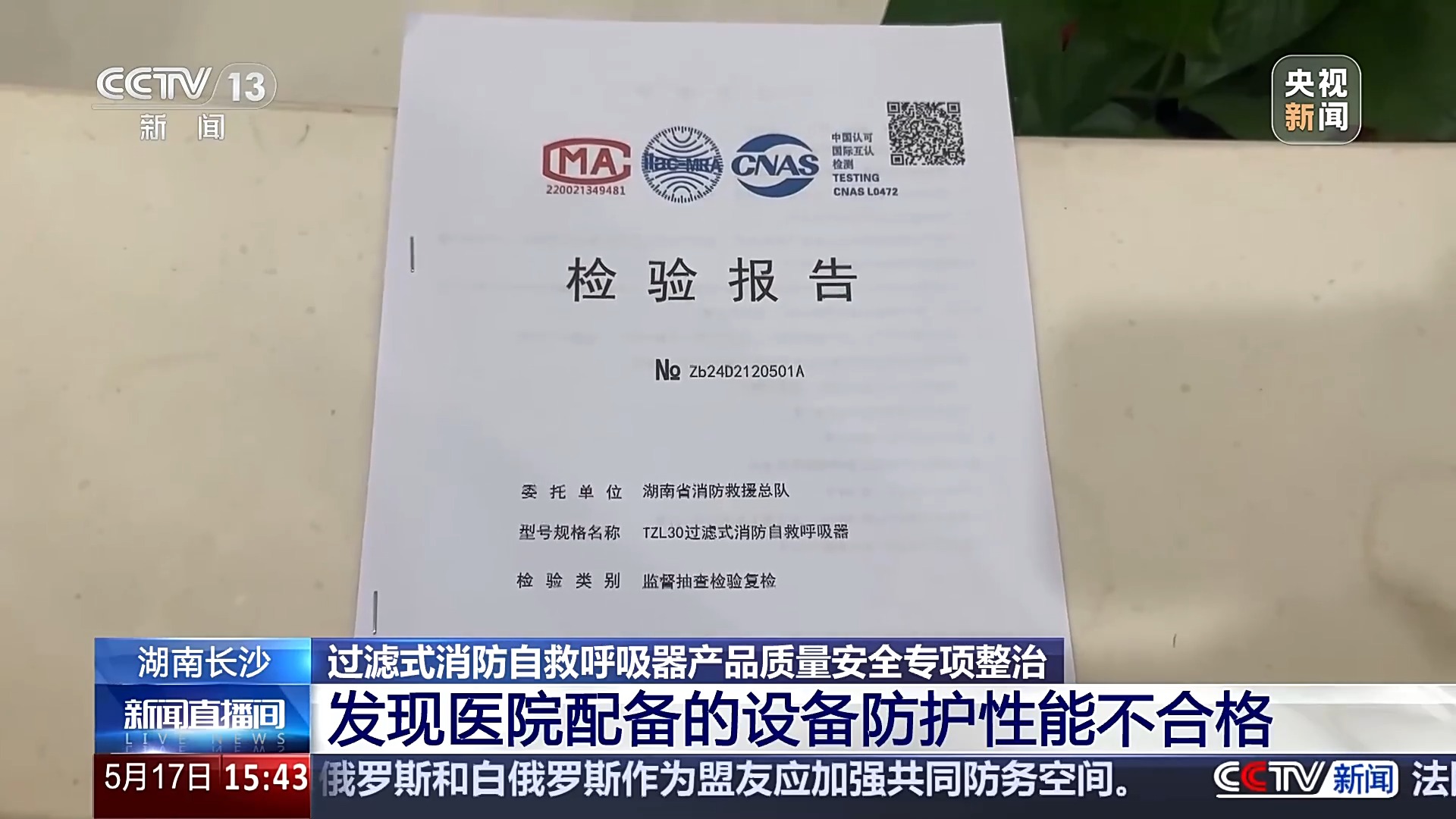 在湖南長沙的一家醫院內,檢查人員將過濾式消防自救呼吸器送去做質量抽檢,檢驗報告顯示,這家醫院配備的過濾式消防自救呼吸器的防護性能不合格。