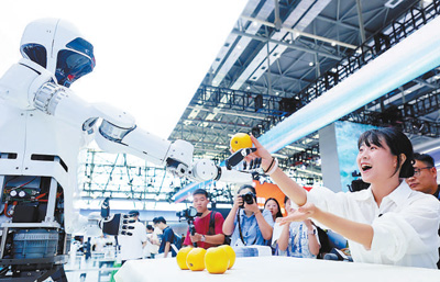 世界製造業大會上,人形機器人“啓江二號”與觀眾互動。“啓江二號”配備多個視覺感知傳感器、高精度慣性測量單元和高精度六維力傳感器,可以完成人類四肢能夠做到的一些基本動作。