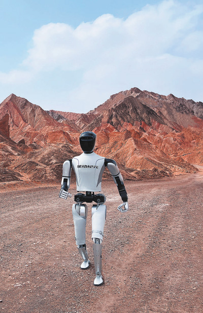 星動紀元第六代人形機器人“星動STAR1”跑步穿越河西走廊丹霞地貌。