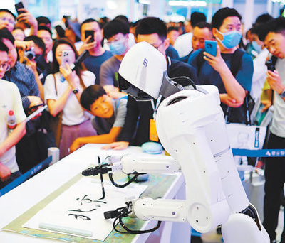 世界機器人大會上,星塵智能機器人S1用毛筆書寫“北京”字樣。