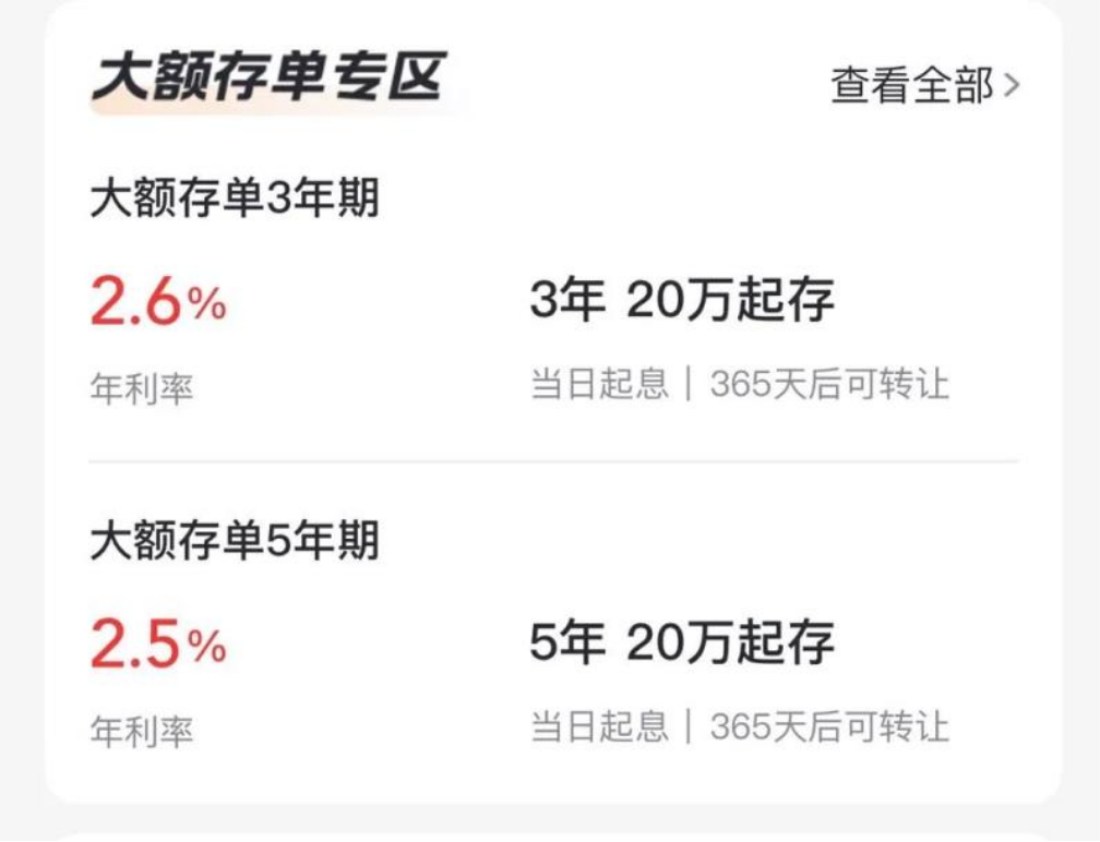 曾被視作高收益攬儲利器的大額存單同樣難逃降息潮。天津銀行“幸福存單”3年期利率降至2.05%,逼近“1時代”;藍海銀行3年期大額存單利率下調至2.3%,與2年期產品持平;錫商銀行3年期大額存單利率(2.6%)甚至高於5年期(2.5%)。這一調整趨勢顯示,銀行正通過壓縮長期負債成本應對息差壓力。