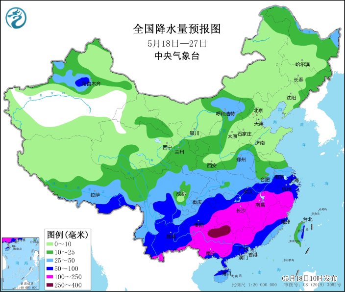 未來10天(5月18-27日),江南、華南大部及貴州、雲南南部、西藏東南部等地累計降水量有50~80毫米,其中江南中南部、華南地區西部和北部等地部分地區有100~180毫米,局地超過250毫米;上述大部地區降水量較常年同期偏多3~6成,部分地區偏多1~2倍,我國其餘大部降水較常年同期偏少或接近常年。